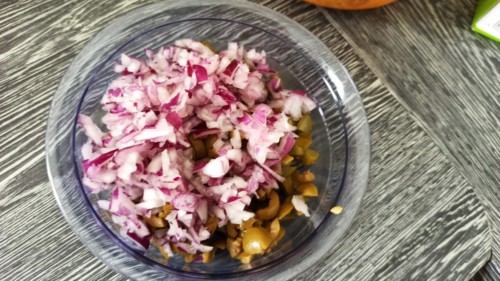 Zwiebel, Oliven und Gewürzgurken fein würfeln, mit Mayonnaise vermengen.