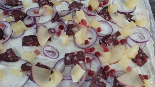 Handkäse, Blutwurst und Apfel in Stücke schneiden, auf dem Teig verteilen.